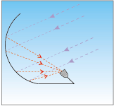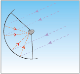 Проблема накопления воды может быть решена использованием офсетных зеркал, представляющих собой верхний сегмент параболоида. Принцип их действия иллюстрируется рис. 2. В северных широтах они располагаются практически перпендикулярно земле, и снег в них тоже почти не накапливается. Правда, усиливаются проблемы с его налипанием на поверхность облучателя.